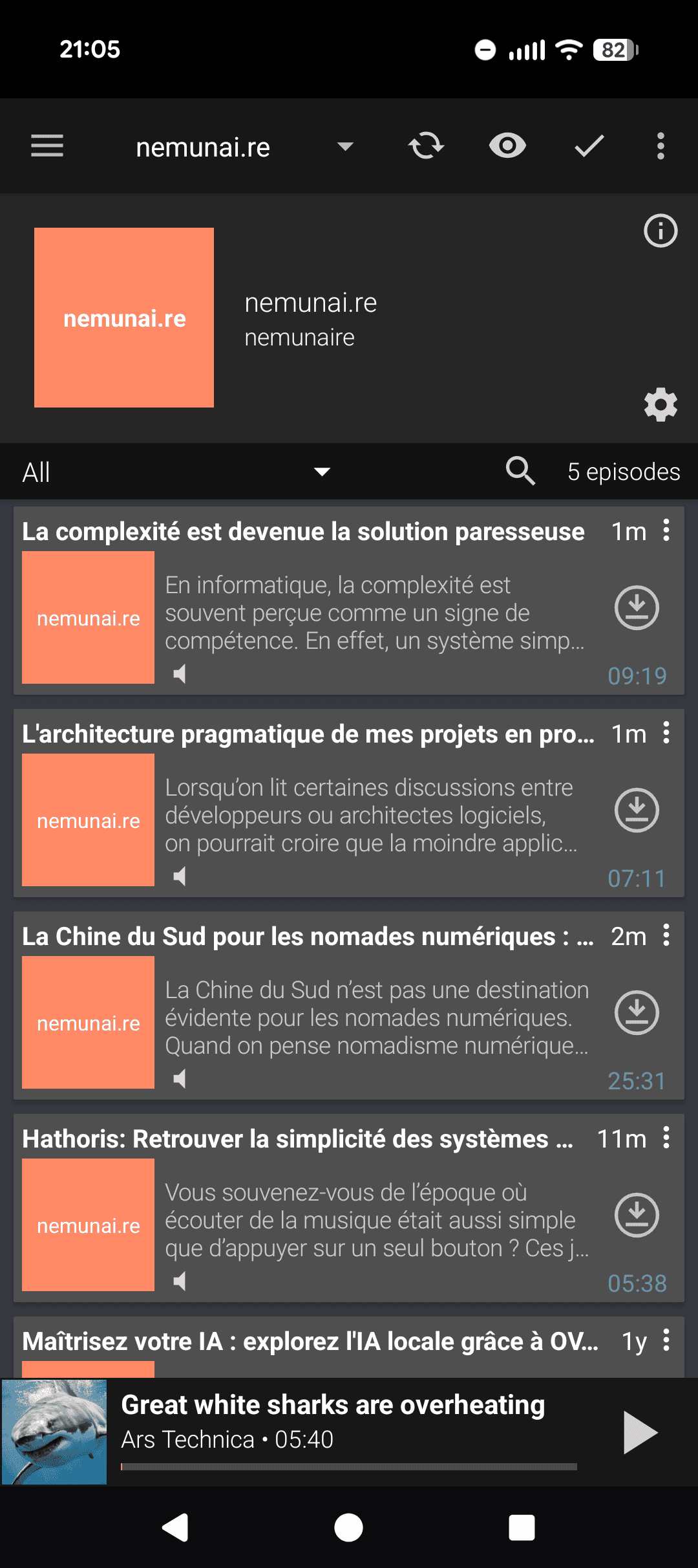 For English, most voices are acceptable, and rss2podcast defaults to en_US-amy-medium. For French, I’m liking fr_FR-siwis-medium.